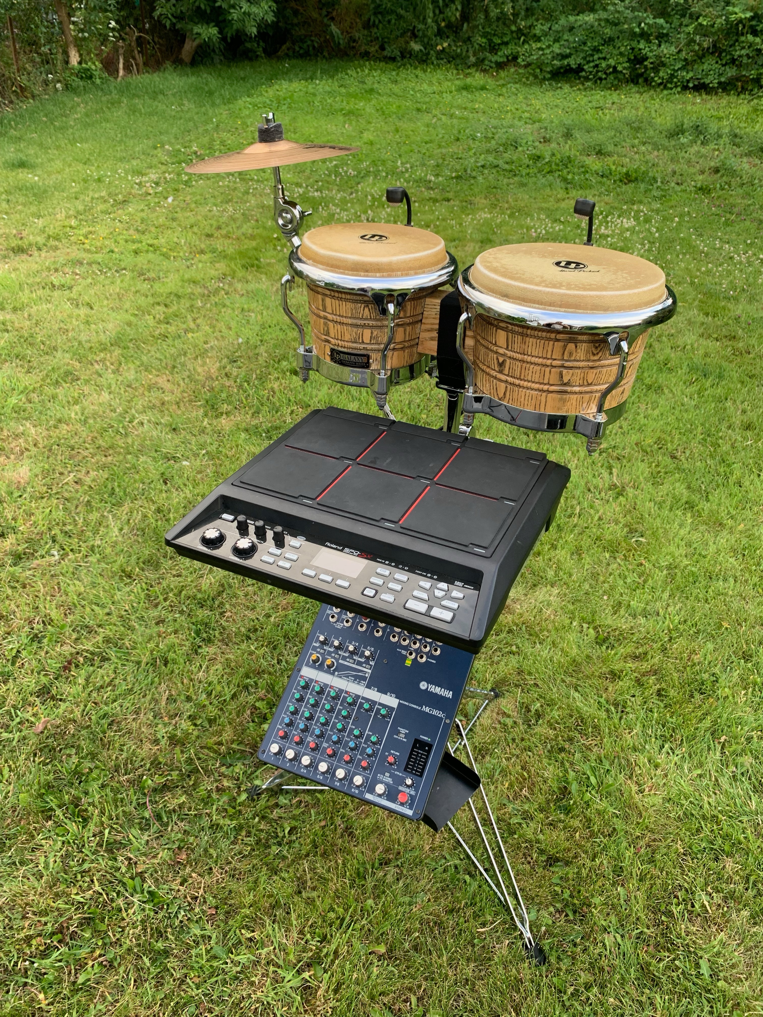 This image shows the combination of both organic and digital percussion. This is TheBongoman set-up of traditional Bongos with the Roland SPD-DX drum machine and Sub-Mixer.