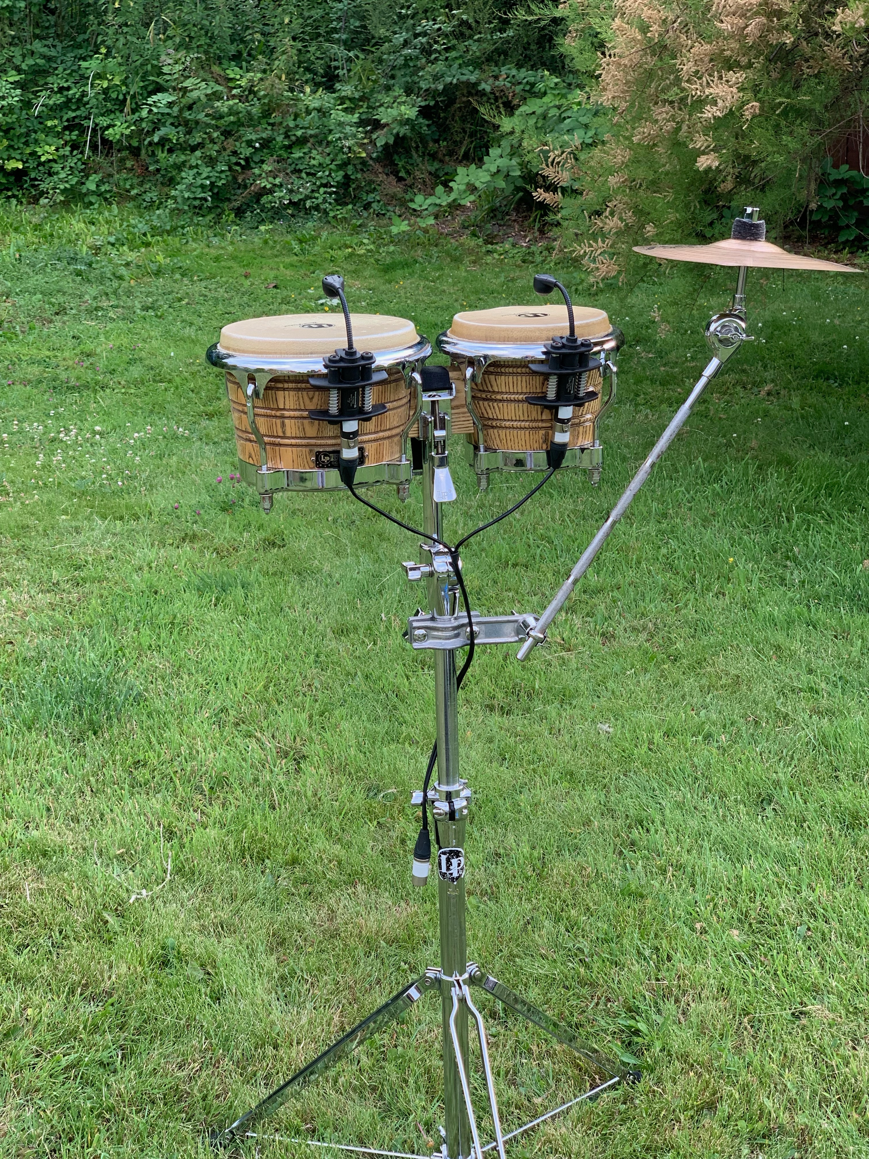 Attached to the bongo stand is a Paiste Splash cymbal. The cymbal helps accentuate build-ups and those big crescendo drops when played!