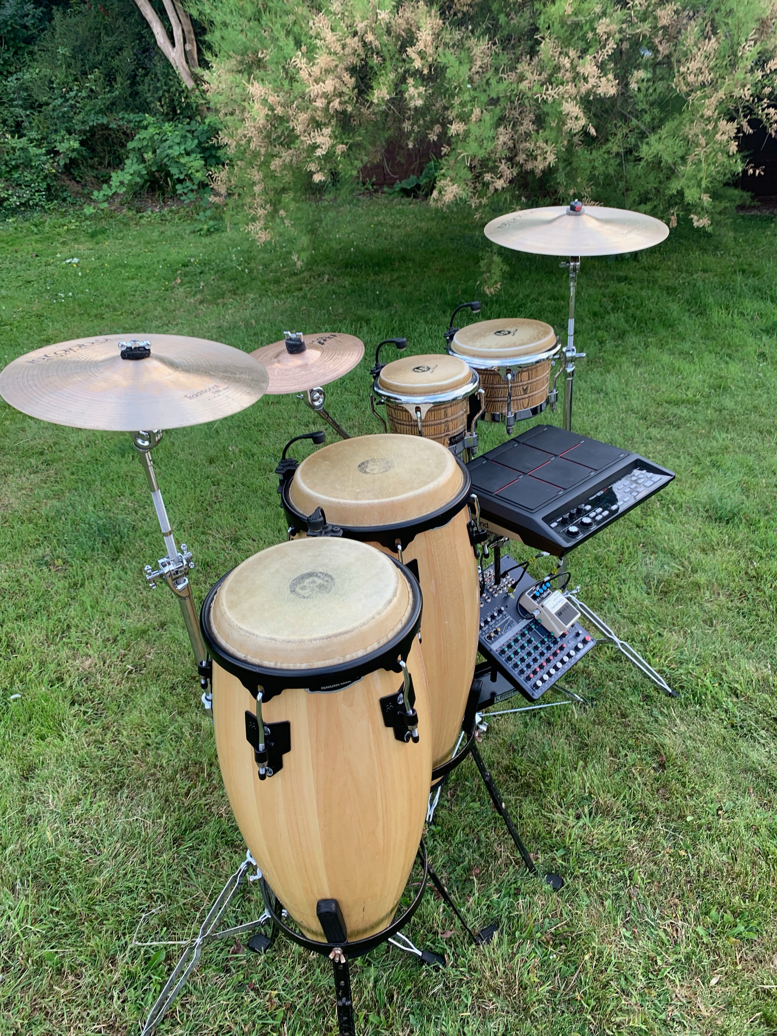 This is the full David H Percussion set-up including bongo’s, conga’s, cymbals, stands, drum machine, microphones, toys and cables.